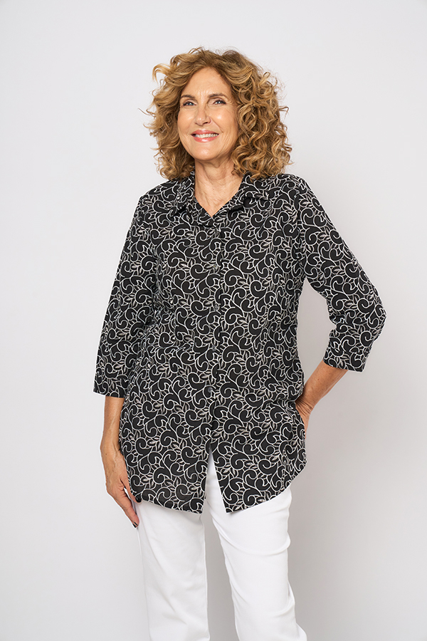48 CAMISOLA EVA. CUELLO SOLAPA Y MANGA 3/4, DETALLE BORDADO CON LUREX. TEJIDO BRODERIE COTTON LISO.