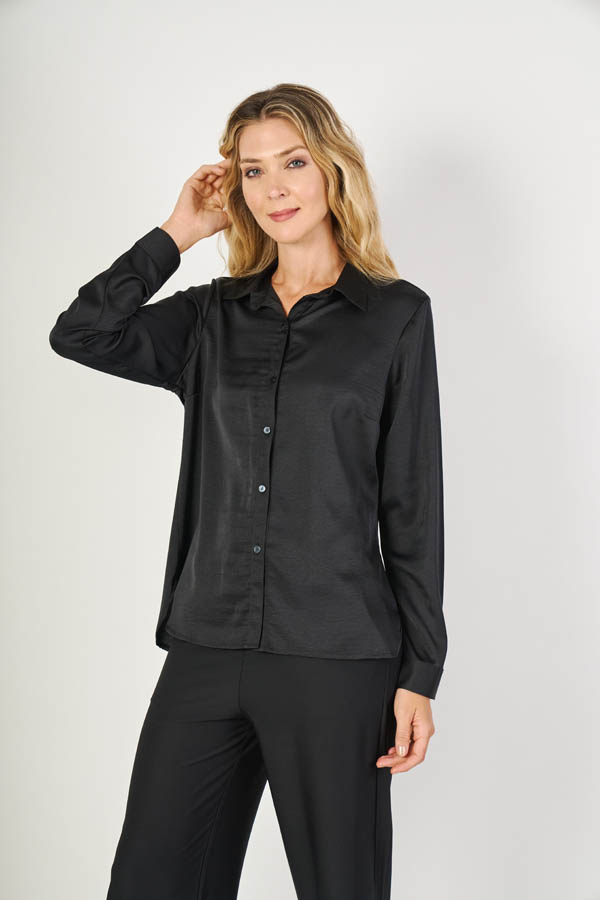 Camisa Paz , clásica infaltable. Cuello solapa y manga larga para un look elegante y versátil. Confeccionada en raso liso, con caída suave y brillo sutil, ideal para llevar tanto en outfits formales como más relajados.