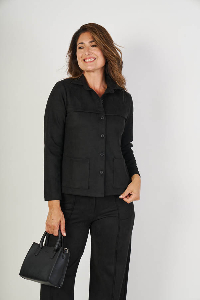 Camisaco Candelaria , abrigo con diseño. Cuello solapa y manga larga, con detalle frontal de pestaña y bolsillos plaqué que suman estilo y funcionalidad. Confeccionado en scuba suede liso, suave al tacto, ideal para completar tu look de media estacion.