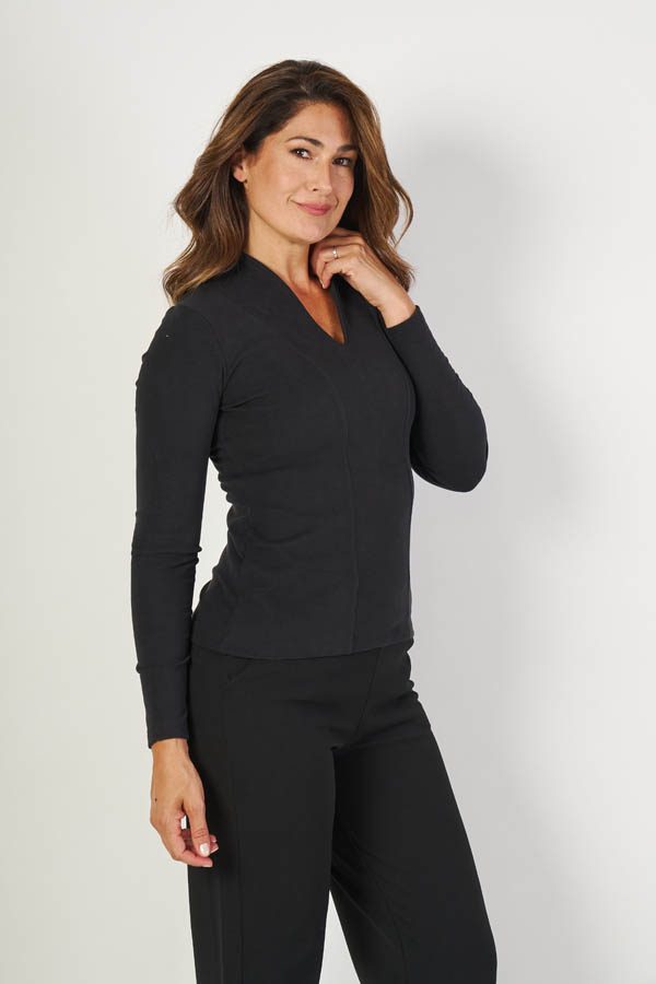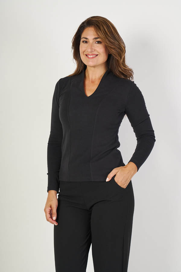 Remera Bahía , sofisticada y versátil. Cuello alto con escote en V y manga larga, con recorte entallado en el frente que realza la silueta. Confeccionada en dralon liso, suave y abrigado, ideal para un look elegante y cómodo a la vez.