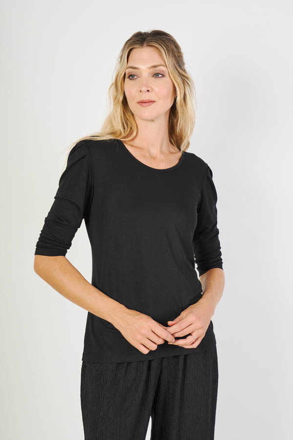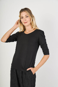 Remera Fausta , femenina y delicada. Escote base y manga 3/4 princesa con pinzas que aportan volumen y un calce elegante. Confeccionada en modal crepé liso, liviano y suave, ideal para un look cómodo con un toque sofisticado.