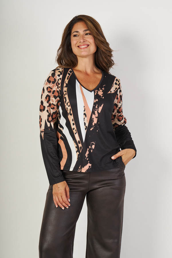 Remera Evelina , con onda y personalidad. Escote en V y manga larga, con estampa animal print combinada en el frente que suma un toque moderno. Confeccionada en modal soft, suave y cómoda, ideal para darle carácter a tus looks de todos los días.