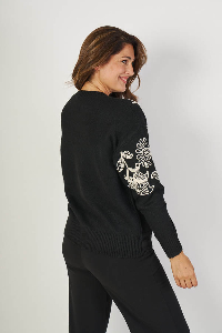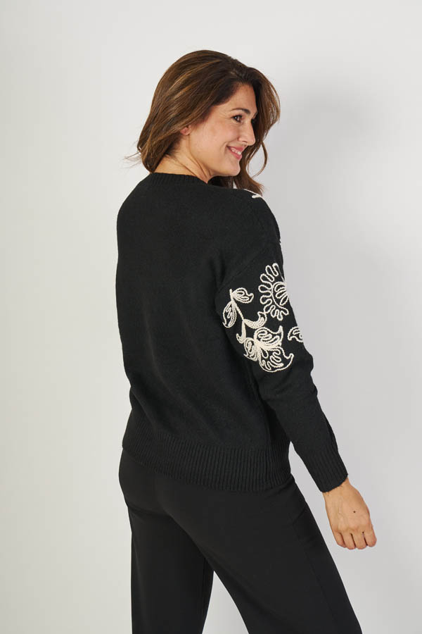 Sweater Wanda , femenino y con detalle. Escote en U con bordado de flor en frente y mangas, y terminaciones en morley para un calce cómodo. Confeccionado en lana acrílica con spandex lisa, ideal para sumar abrigo con un toque delicado.