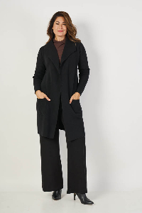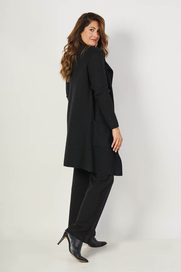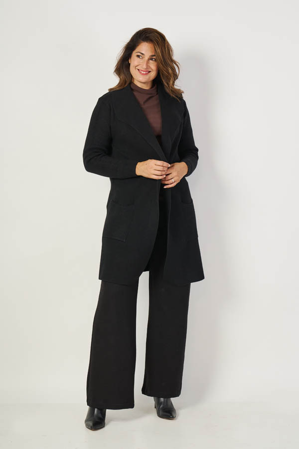 Saco Largo Madrid , elegante y moderno. Cuello smoking y manga larga, con vistas combinadas en morley. Detalle de dos bolsillos plaqué que suman funcionalidad. Confeccionado en cashmere liso, suave y abrigado, ideal para un look sofisticado y urbano.