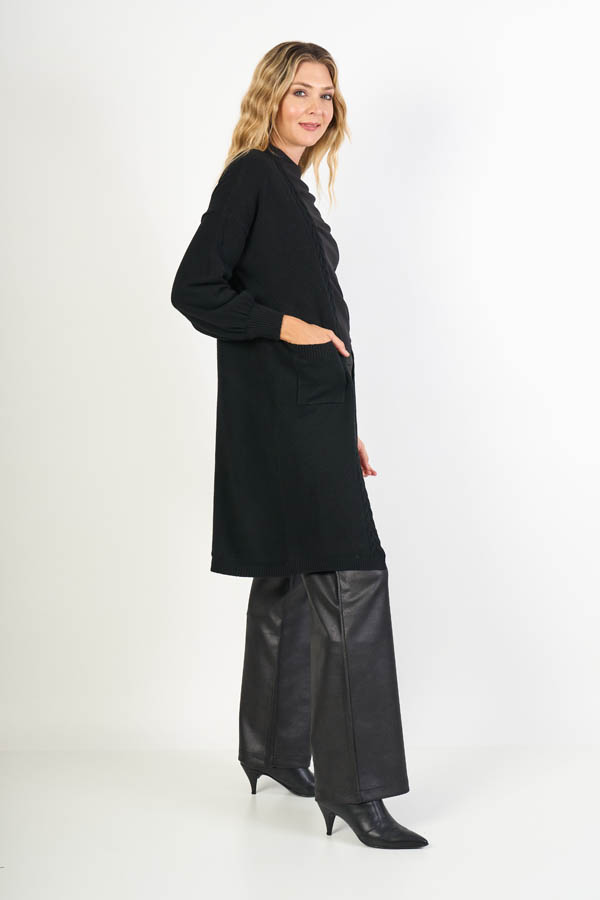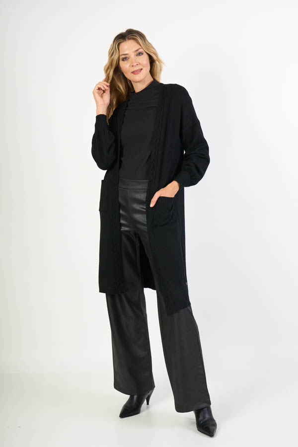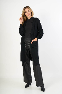 Saco Largo Aurora , delicado y con diseño. Manga 3/4 con puño en morley, frente con guardas trenzadas y bolsillos plaqué que suman estilo y detalle. Confeccionado en cashmere liso, suave y abrigado, ideal para un look femenino y sofisticado.