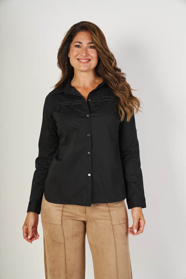 Camisa Marlene , clásica con diseño. Cuello solapa y manga larga con traba, con recorte en el frente y tiras horizontales combinadas con símil presillas. Confeccionada en poplin liso, liviano y cómodo, ideal para un look urbano con estilo.