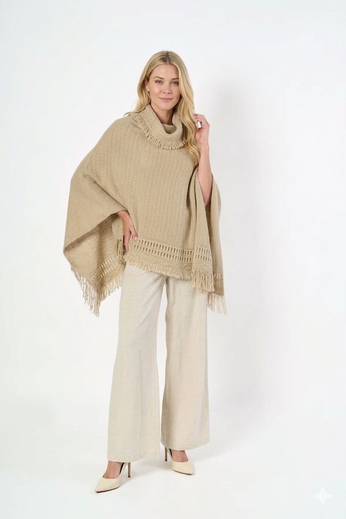 Poncho Rosana: diseño elegante y versátil con un aire cálido y moderno. De calce suelto y cómodo, se destaca por su cuello amplio que aporta abrigo y estilo. Ideal para lucir sofisticada y relajada en cualquier ocasión.